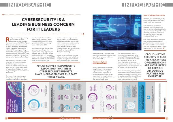 Rackspace Technology , a leading end-to-end multi-cloud technology services company , has announced over half ( 59 %) of global IT leaders cite cybersecurity as one of their C-suite ’ s top three business concerns , ahead of issues such as inflation ( 51 %) retaining and hiring talent ( 45 %) and supply chain / logistics management ( 45 %), according to a new survey of 1,420 global IT professionals conducted by Rackspace Technology .