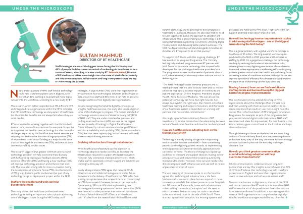 Staff shortages are one of the biggest issues facing the NHS today and 49 % of people find the current standard of technology in healthcare to be a source of stress , according to a new study by BT . Sultan Mahmud , Director of BT Healthcare , offers some insight into the state of HealthTech currently and why communication , collaboration and long-term partnerships are key to overcoming the barriers .